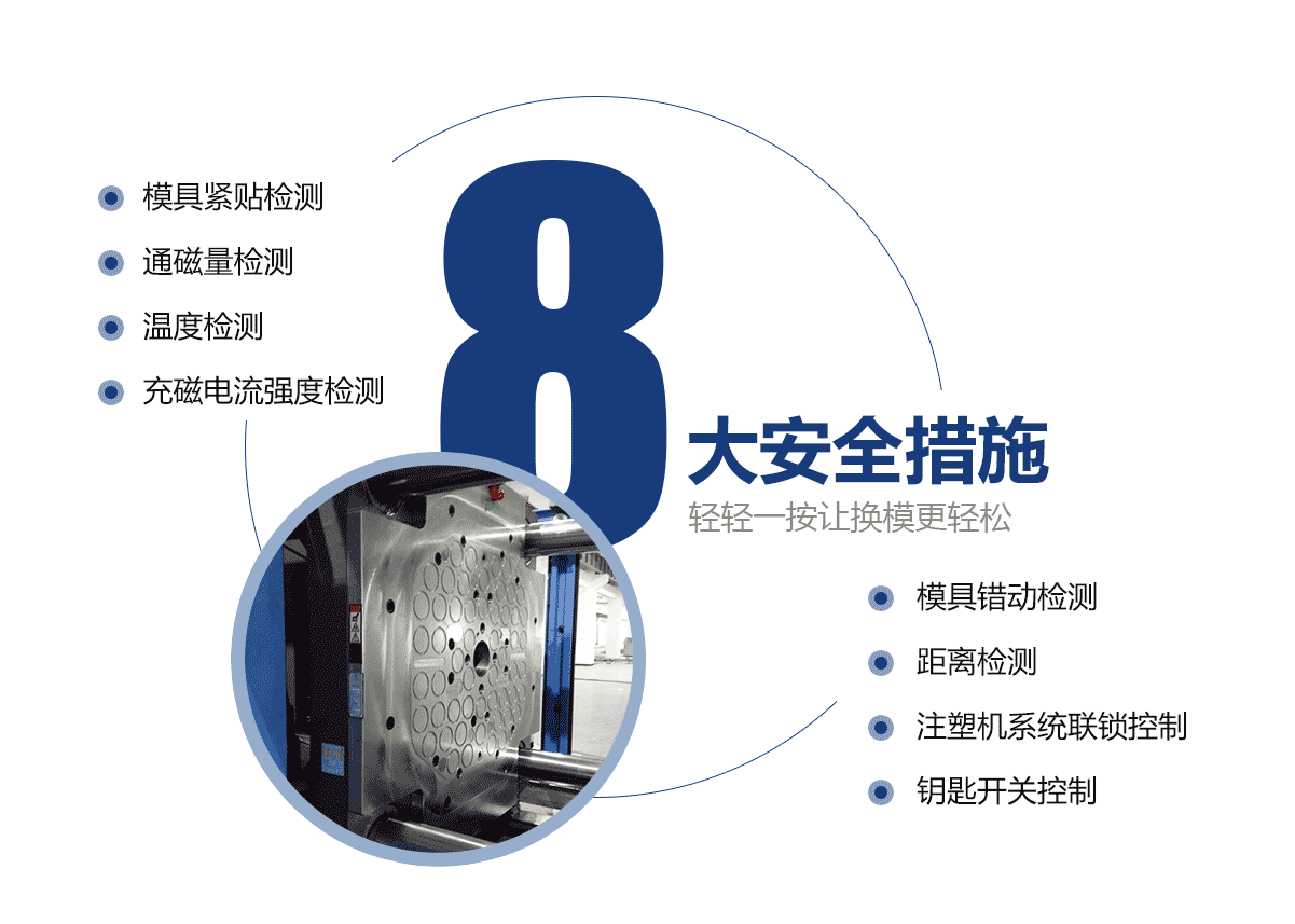 • 電永磁磁力模板大大提高注塑機(jī)換模效率。 自動化注塑機(jī)的換模方法僅需3分鐘即可完成。特大型注塑機(jī)模板的換模時(shí)間從超過2小時(shí)減少到10分鐘。